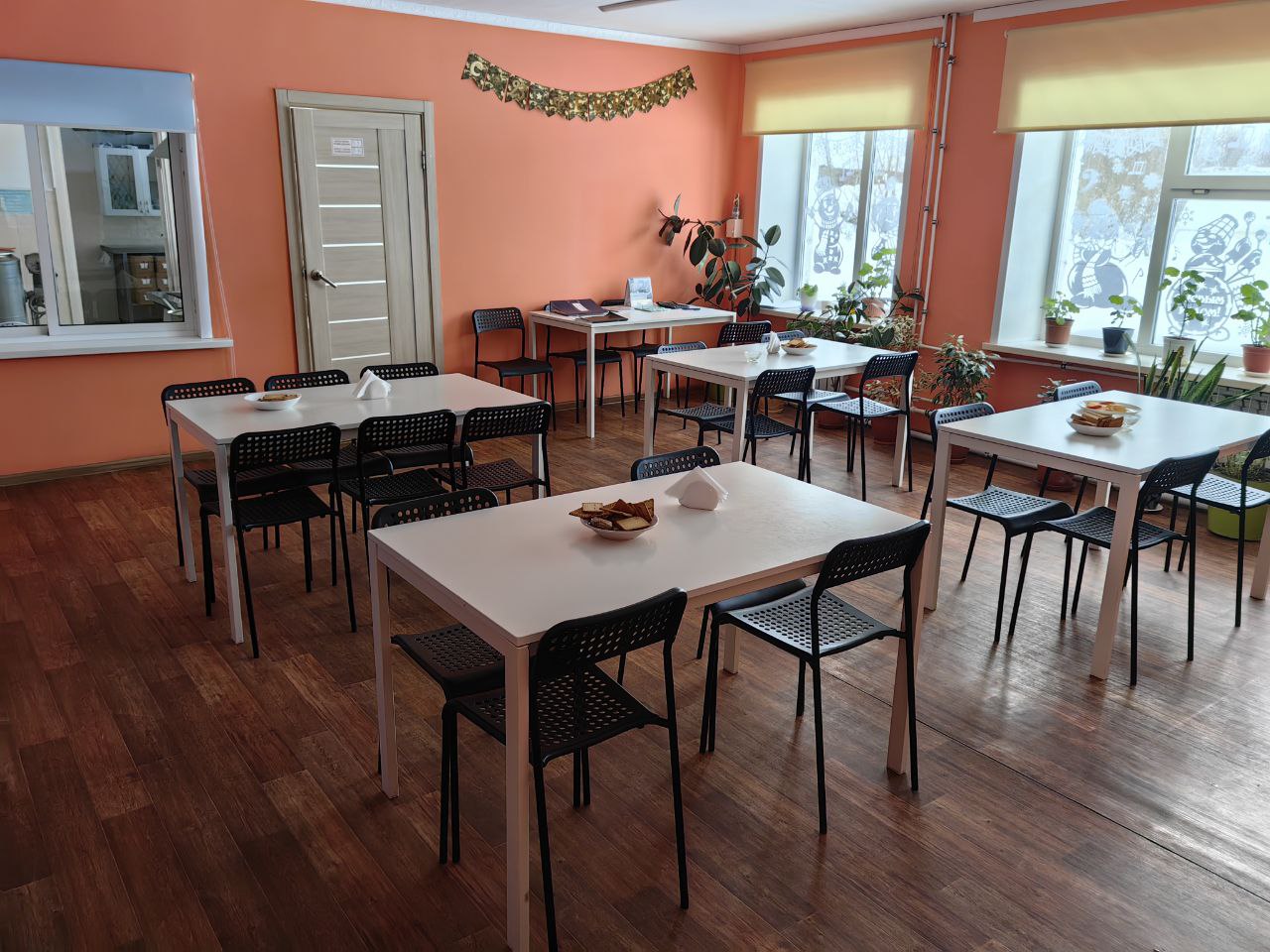 Несовершеннолетние в учреждении получают полноценное сбалансированное 5-ти разовое питание. Прием пищи осуществляется в светлой, современной столовой, рассчитанной на 24 посадочных места. В столовой имеется отделение для мытья посуды, оснащенное водонагревателем, системой моек.