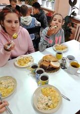 После выполнения домашнего задания старшие ребята занялись приготовлением салата « Оливье». В кружке «Домоводства» они не только учатся готовить разные блюда, но и приучаются к аккуратности, вниманию, соблюдению техники безопасности в быту.