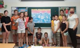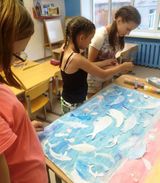 Затем нарисовали на большом листе океан, вырезали из бумаги китов и дельфинов. И символично запустили их в импровизированный океан.
